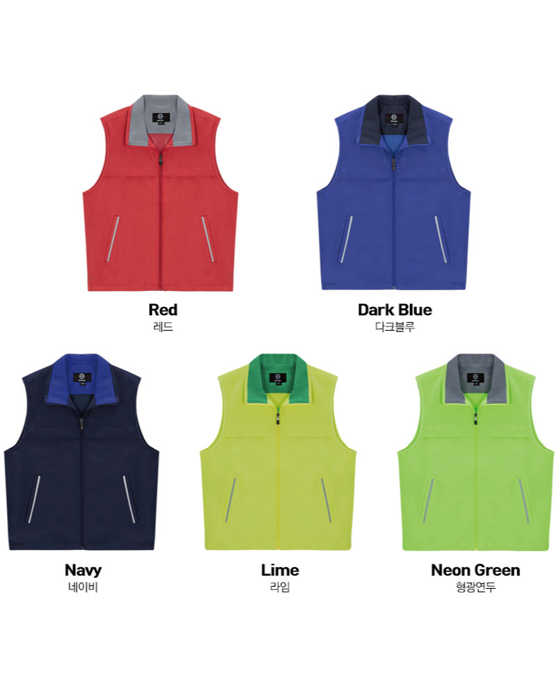 8개 색상 , 베이직한 기본 디자인으로 등판에 망사가 있는 바람막이 조끼, 단체 행사복이나 이벤트 의류등으로 활용하기 좋은 제품