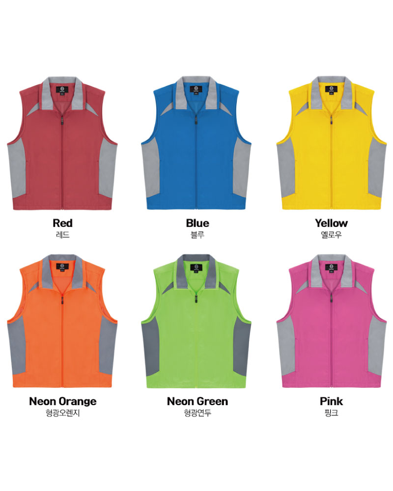 6개 색상 , 베이직한 기본 디자인으로 등판에 망사가 있는 바람막이 조끼, 단체 행사복이나 이벤트 의류등으로 활용하기 좋은 제품