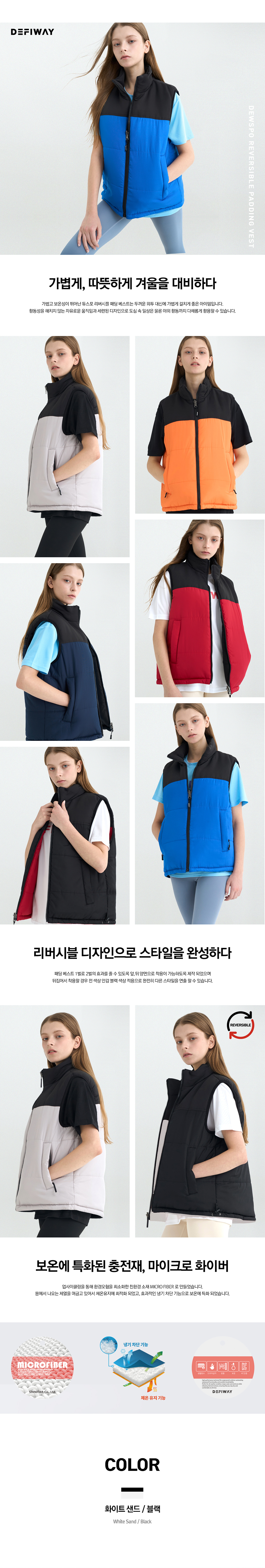 패딩조끼 하나로 두가지 컨셉을 연출 할수 있는 리버시블 스타일의 듀스포 소재의 패딩 조끼로 축구 배구 농구 등 팀스포츠 활동에 적합한 기능적인 디자인