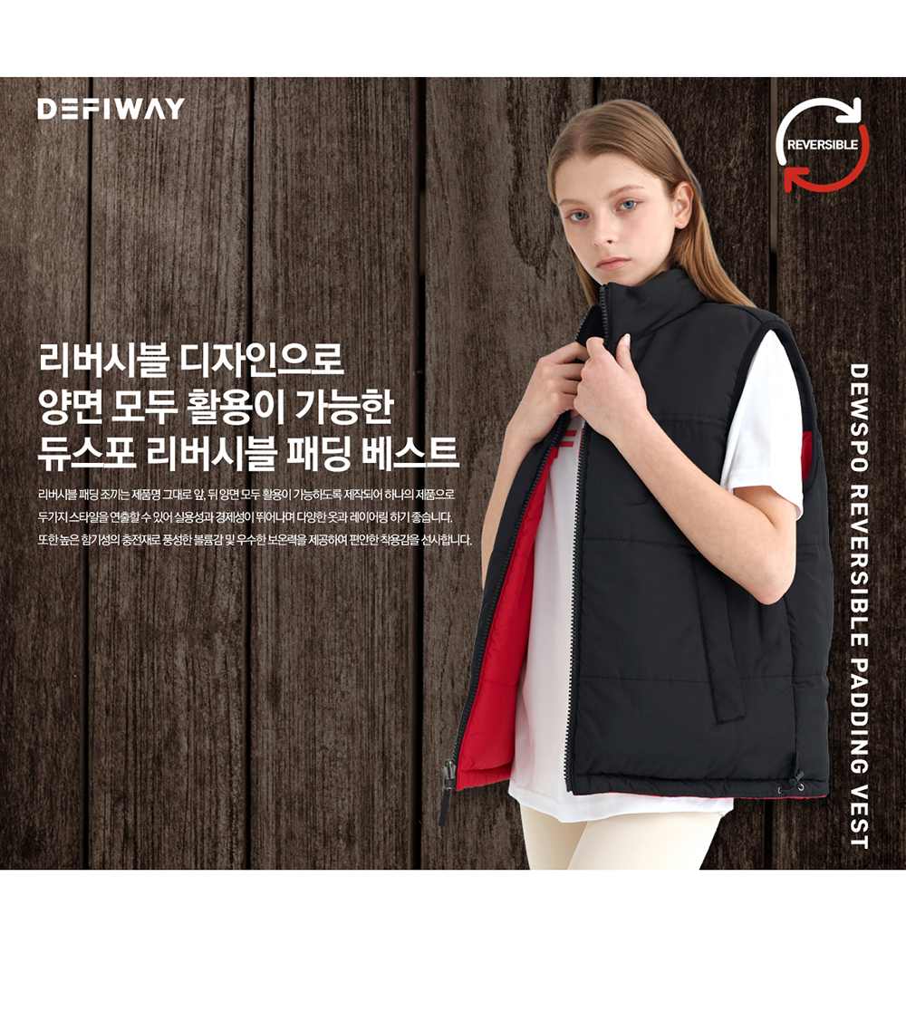 패딩조끼 하나로 두가지 컨셉을 연출 할수 있는 리버시블 스타일의 듀스포 소재의 패딩 조끼로 축구 배구 농구 등 팀스포츠 활동에 적합한 기능적인 디자인
